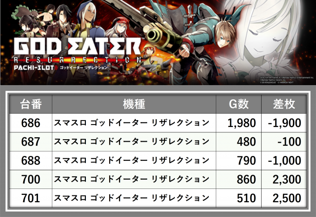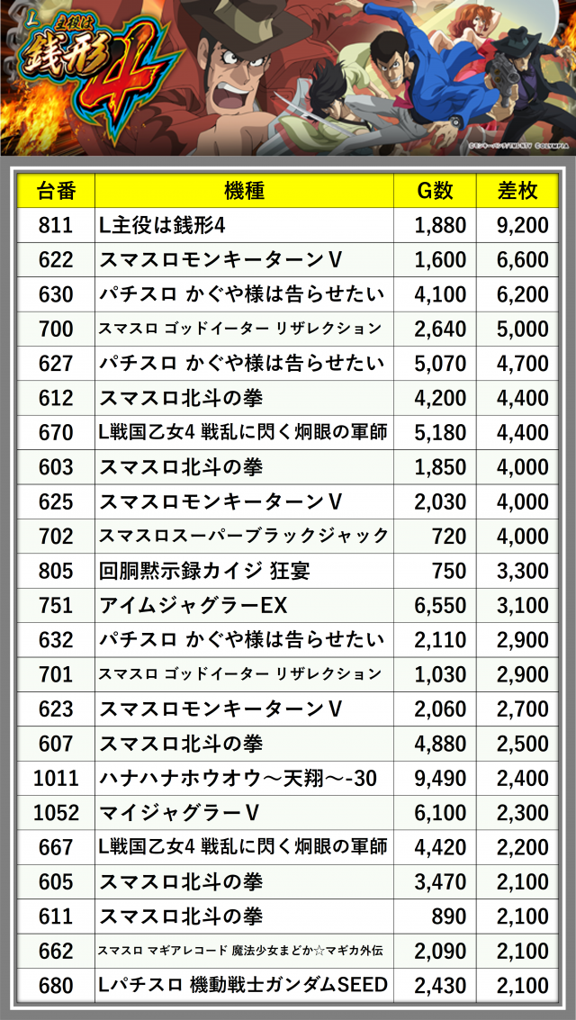 厳選された取材対象機種をはじめ、その他スロット全体から好記録が飛び出した!プレイヤーが楽しんだ1日を下記データにて振り返ってみて欲しい。
