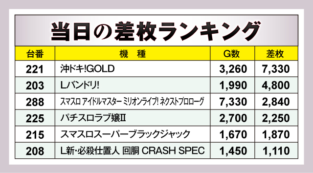 優秀台を見てみると、トップに輝いたのは+7,330枚を記録した『沖ドキ!GOLD』の221番台。沖スロならではのパワーを存分に見せてくれた。+4,800枚でそれに続いたのが『Lバンドリ!』203番台。この機種もなかなかのポテンシャルを持っている。以下、+2,840枚の『スマスロ アイドルマスター ミリオンライブ! ネクストプロローグ』288番台、+2,250枚の『パチスロラブ嬢Ⅱ』225番台、+1,870枚の『スマスロスーパーブラックジャック』215番台と続いた。