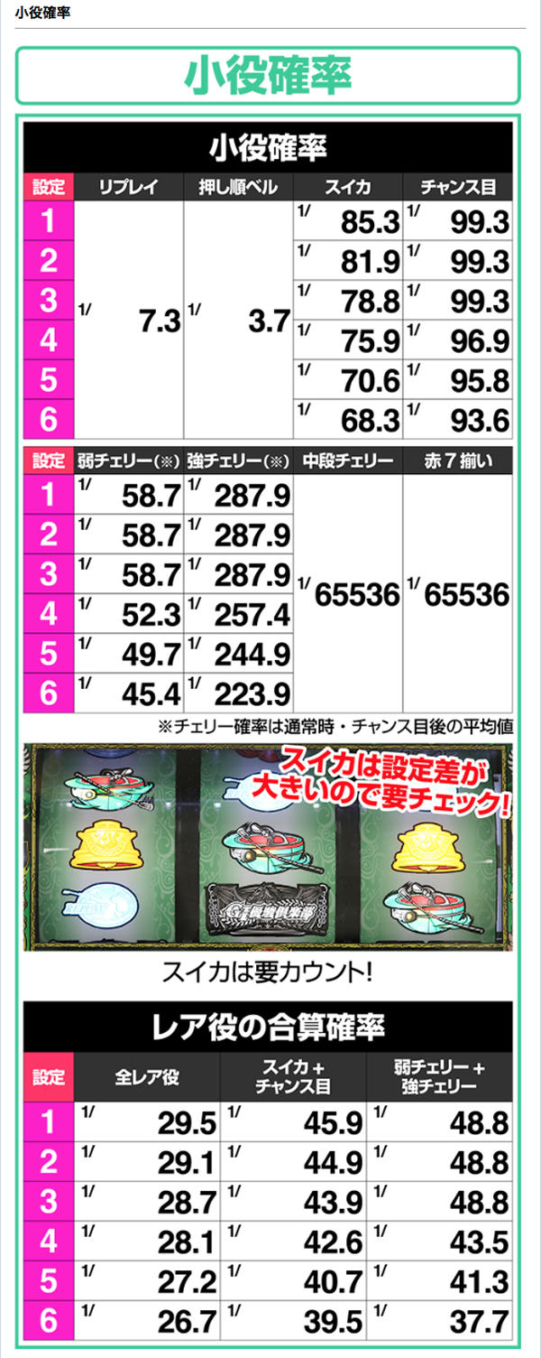 スイカ確率に大きな設定差があるので、しっかりカウントしながら打ち進めていきたい。