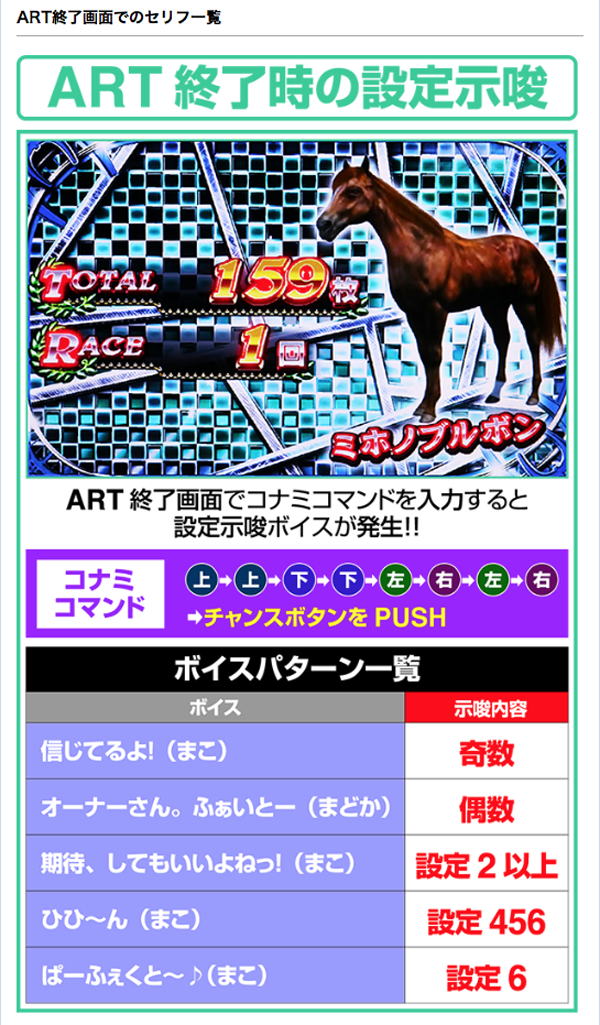 また、ARTの終了時にも設定示唆が存在。ART終了画面表示中、十字キーでコナミコマンドを入力すれば設定を示唆するボイスが発生する。