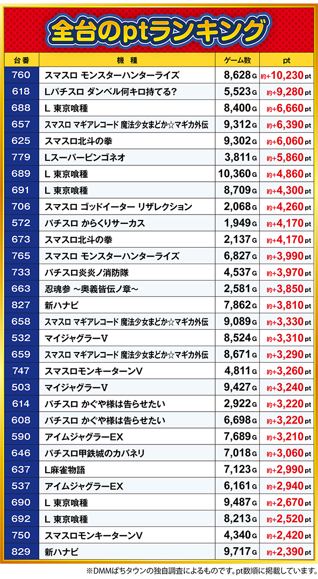 ほかにも、「スマスロ マギアレコード 魔法少女まどか☆マギカ外伝」の657番台や「スマスロ北斗の拳」の625番台が約+6,000pt以上となった。