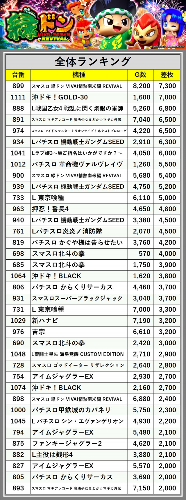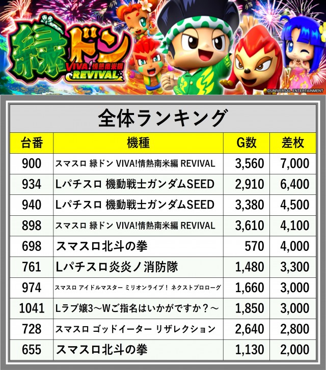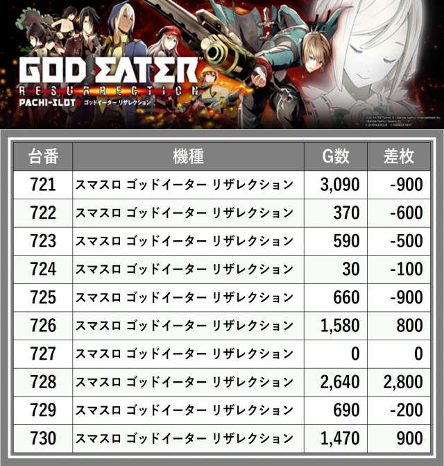 厳選された取材対象機種をはじめ、その他スロット全体から好記録が飛び出した!プレイヤーが楽しんだ1日を下記データにて振り返ってみて欲しい。
