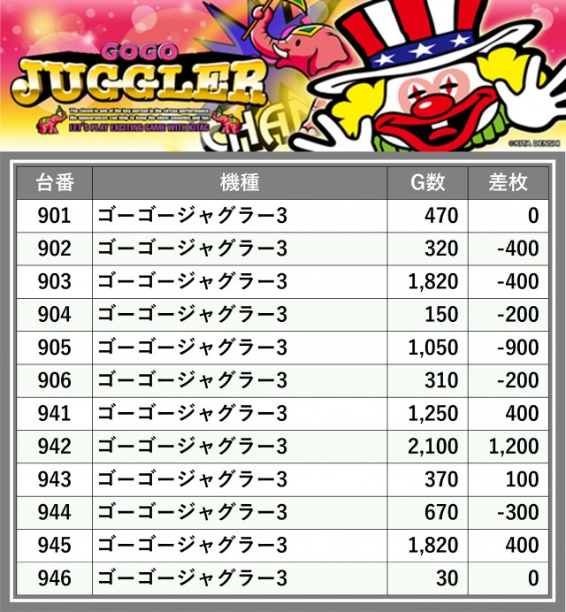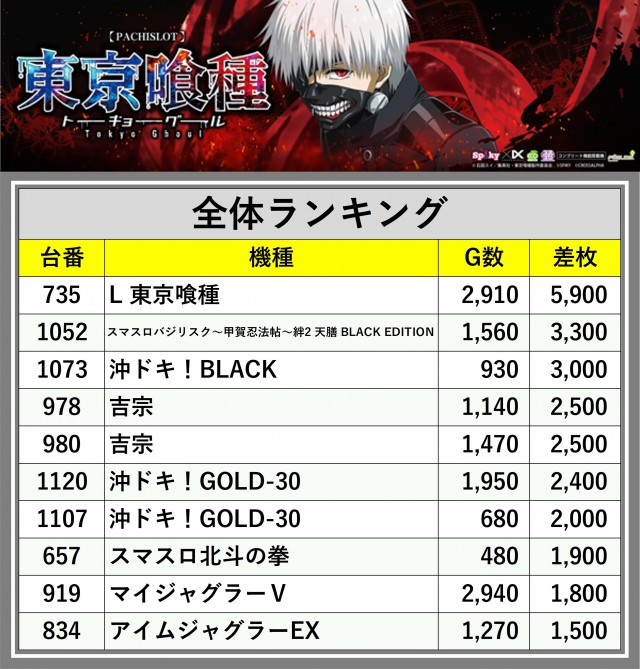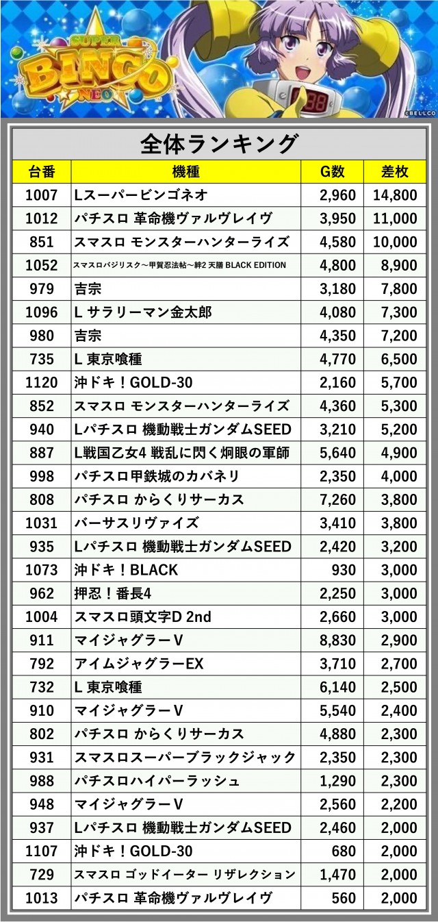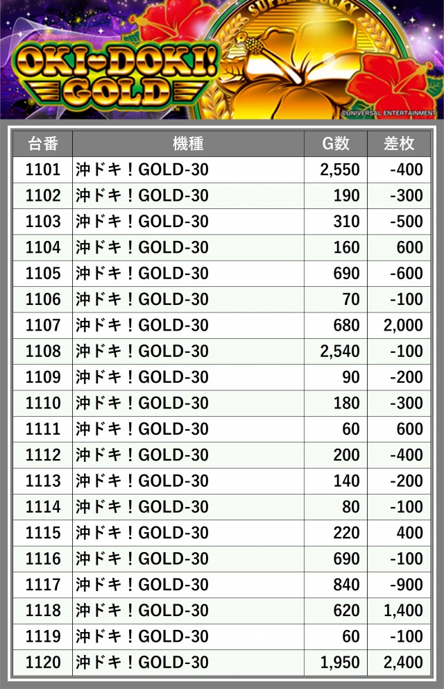 厳選された取材対象機種をはじめ、その他スロット全体から好記録が飛び出した!プレイヤーが楽しんだ1日を下記データにて振り返ってみて欲しい。