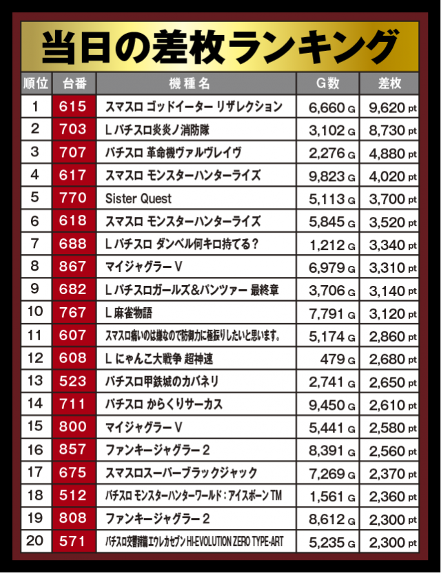 【差枚ランキング&注目機種】SAP武蔵村山(東京都)