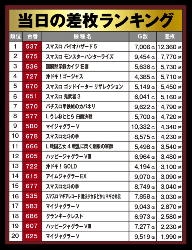 【差枚ランキング&注目機種】SAP北野(東京都)
