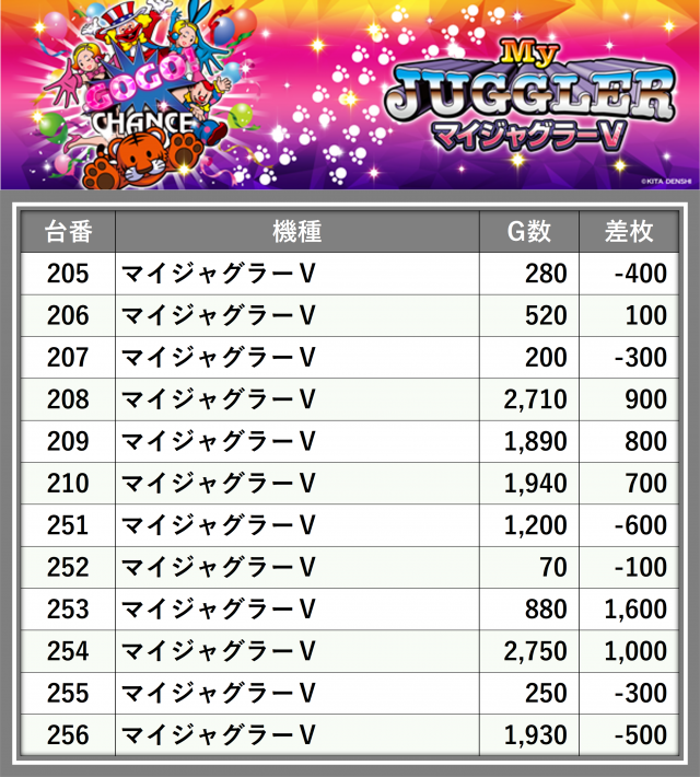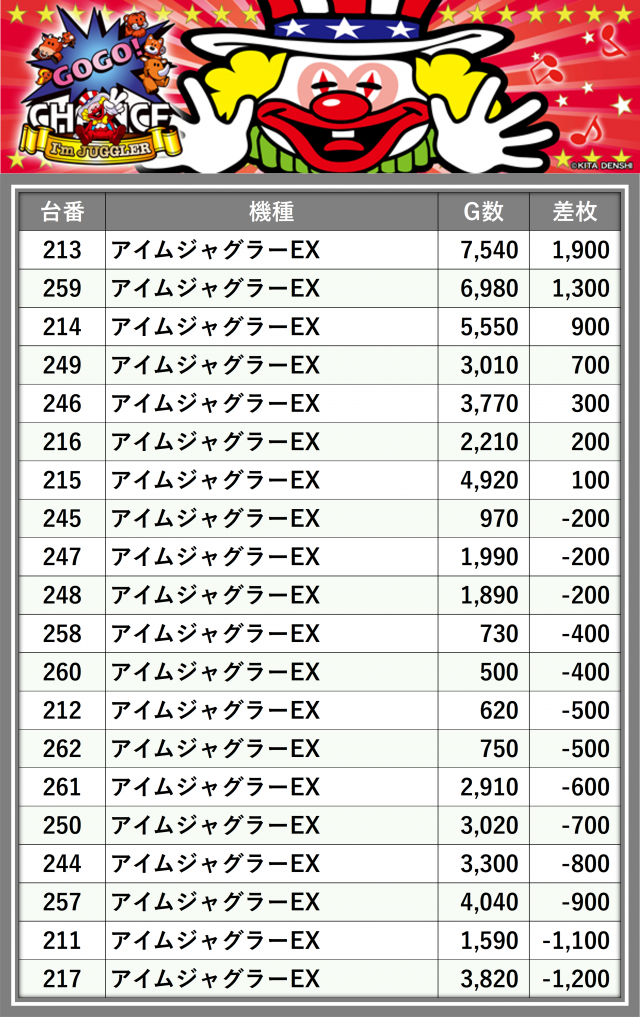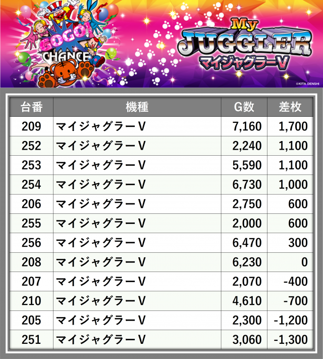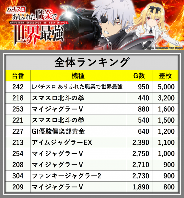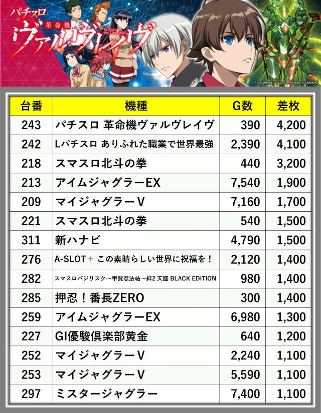 厳選された取材対象機種をはじめ、その他スロット全体から好記録が飛び出した!プレイヤーが楽しんだ1日を下記データにて振り返ってみて欲しい。