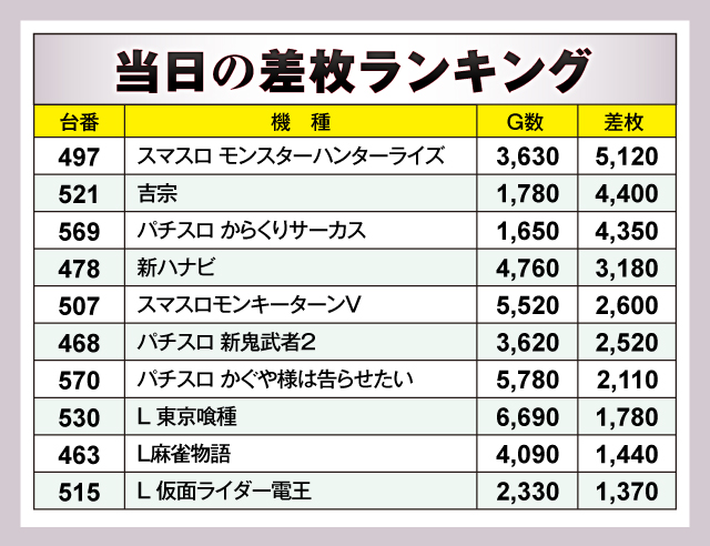 まずは差枚ランキングのチェックから。上表の10台のうち7台が差枚+2,000枚オーバーで、+3,000枚オーバーは4台出現! それらのなかでもっとも優秀だったのは、497番台の『スマスロ モンスターハンターライズ』で、差枚は+5,120枚と大台を突破! 他にもスマスロ人気機種多くランクインし、ホールの至るところにチャンスが存在していたことを窺わせている。
