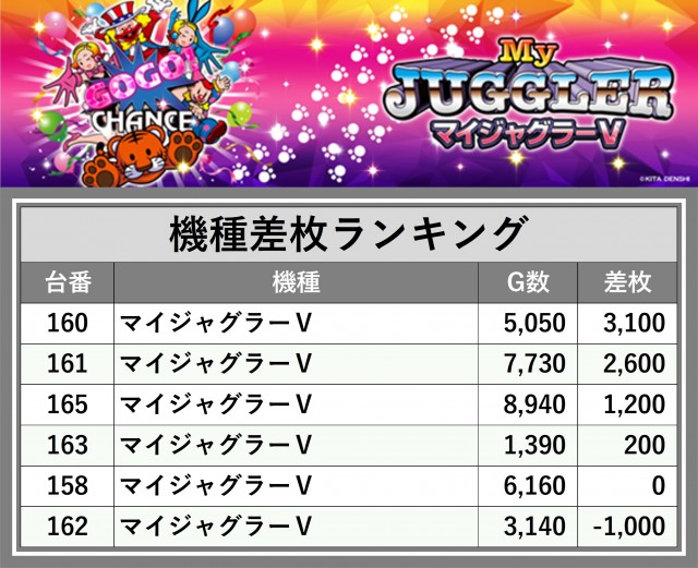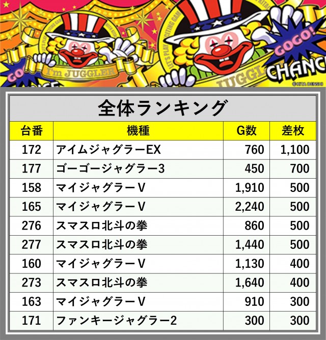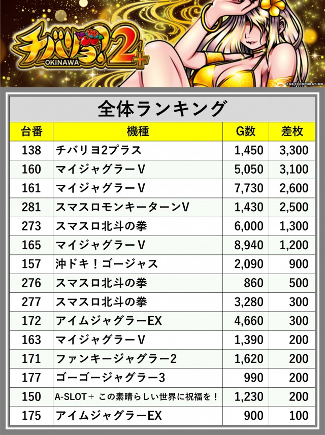 厳選された取材対象機種をはじめ、その他スロット全体から好記録が飛び出した!プレイヤーが楽しんだ1日を下記データにて振り返ってみて欲しい。