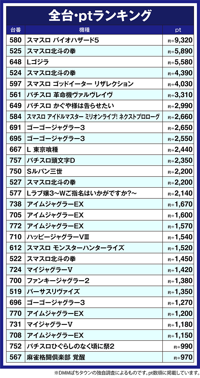 最新機種もにぎわいが大きく、「スマスロ アイドルマスター ミリオンライブ! ネクストプロローグ」の584番台が約+2,600ptを上回った。