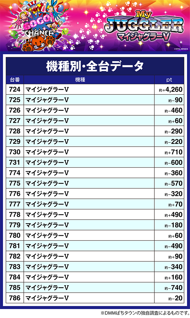 「マイジャグラーⅤ」では、724番台が約+4,260pt。