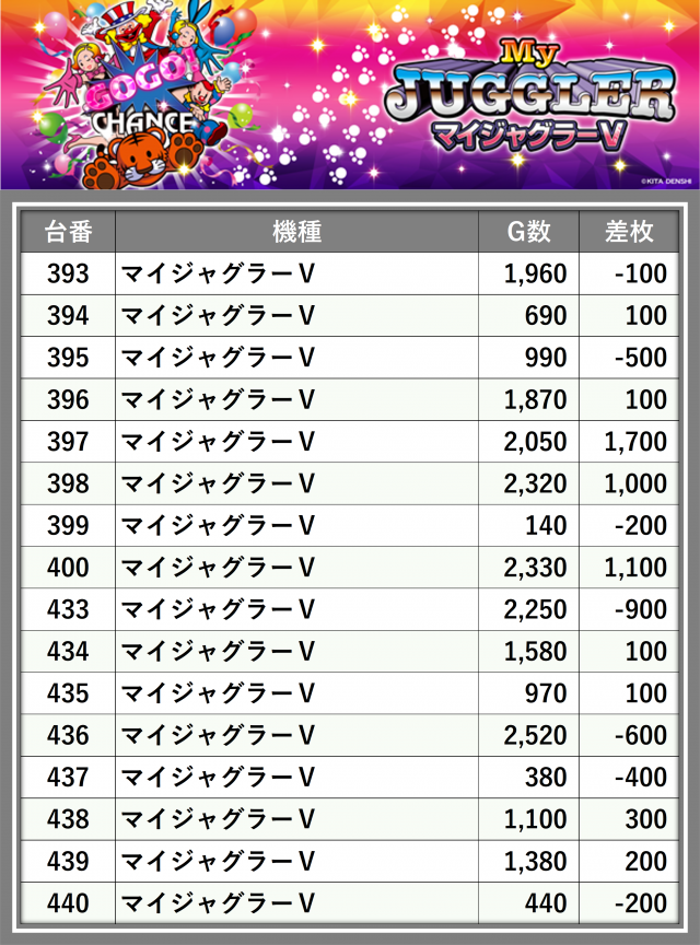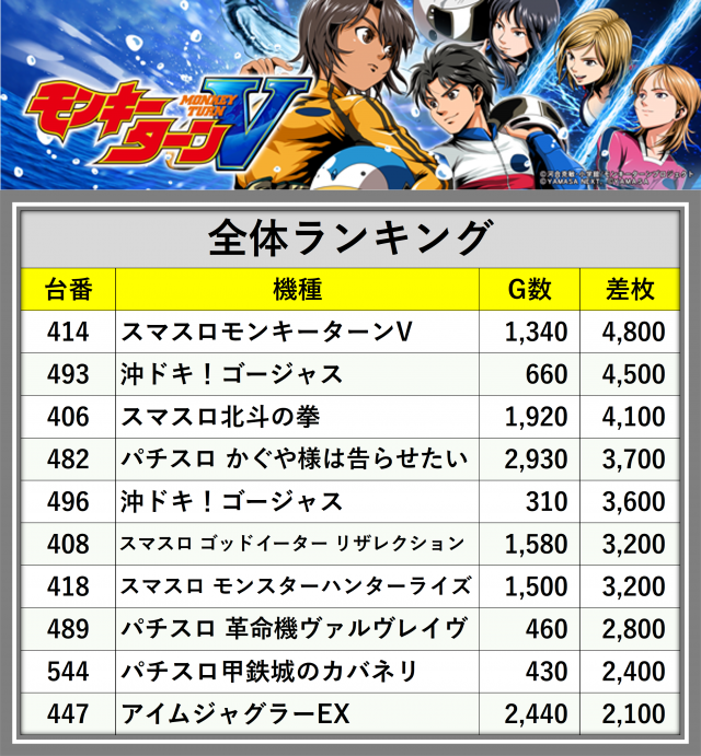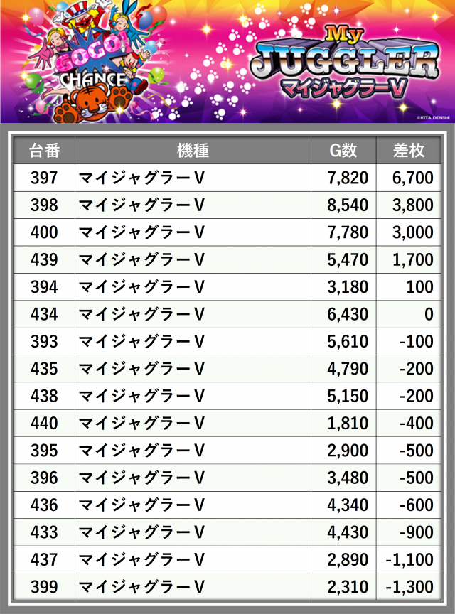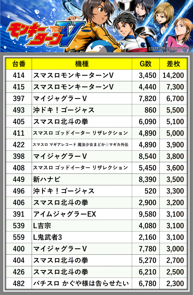 厳選された取材対象機種をはじめ、その他スロット全体から好記録が飛び出した!プレイヤーが楽しんだ1日を下記データにて振り返ってみて欲しい。