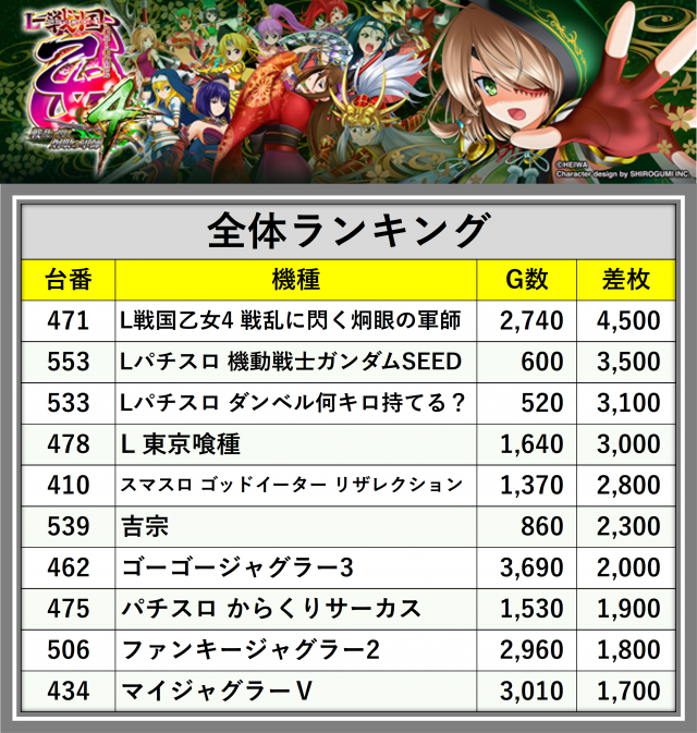 厳選された取材対象機種をはじめ、その他スロット全体から好記録が飛び出した!プレイヤーが楽しんだ1日を下記データにて振り返ってみて欲しい。