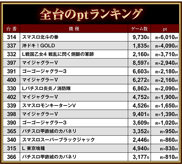 「ゴーゴージャグラー3」の390番台と391番台は、並んで約+1,000ptを超えた。