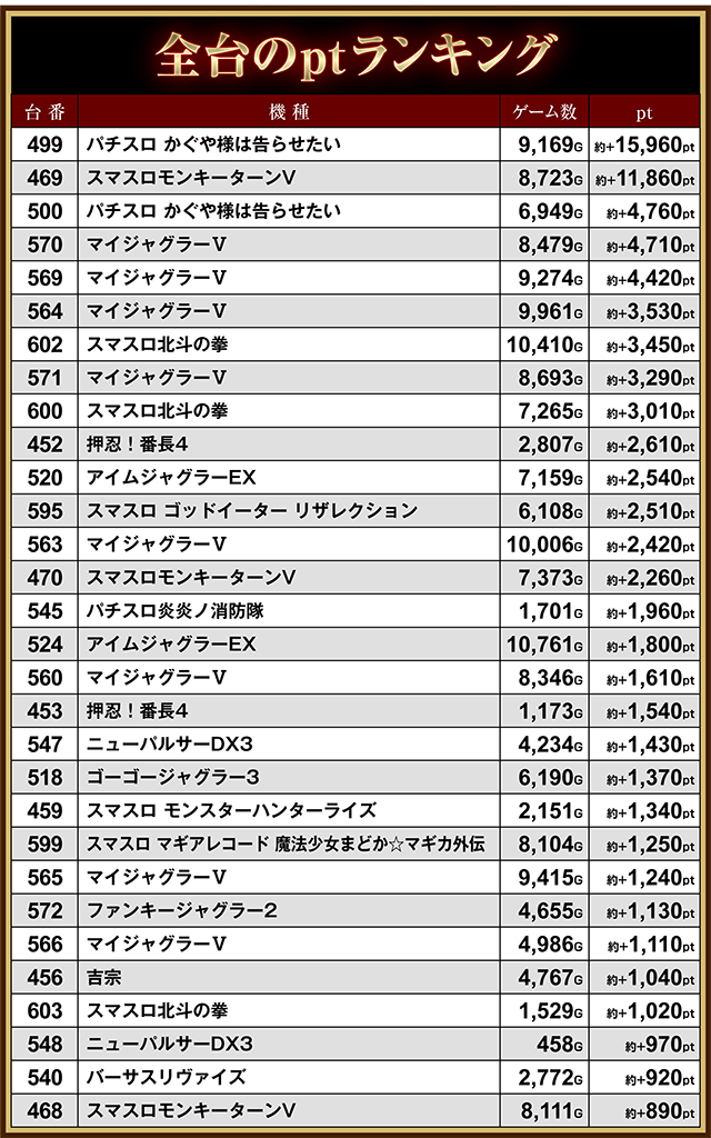 「マイジャグラーⅤ」の570番台と569番台も約+4,700ptオーバーと、幅広い機種に活気があった。