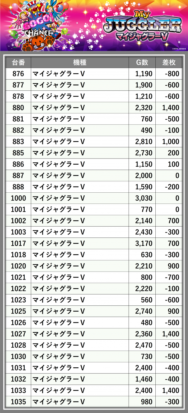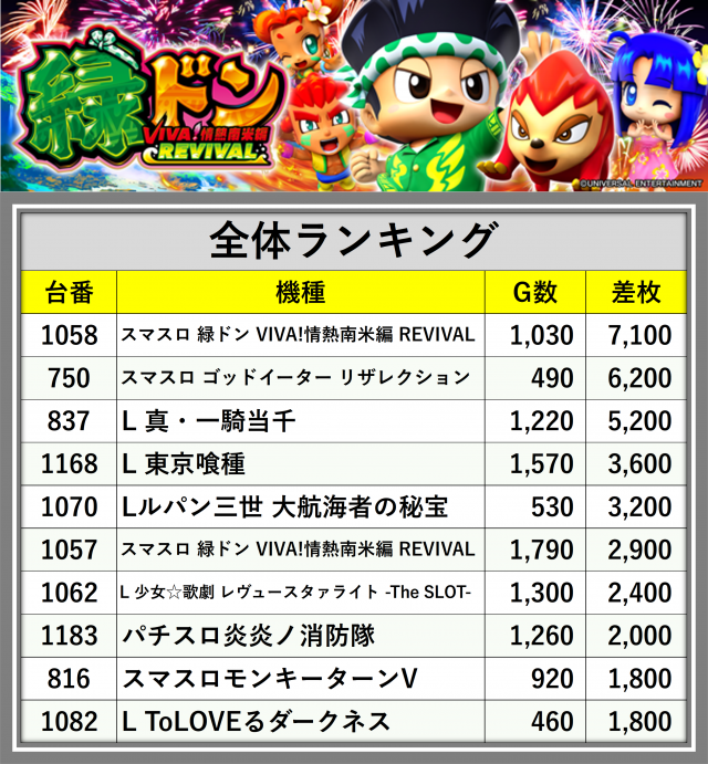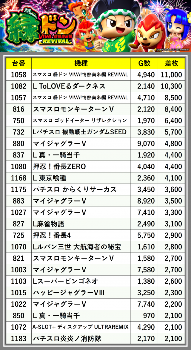 厳選された取材対象機種をはじめ、その他スロット全体から好記録が飛び出した!プレイヤーが楽しんだ1日を下記データにて振り返ってみて欲しい。
