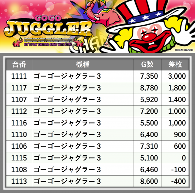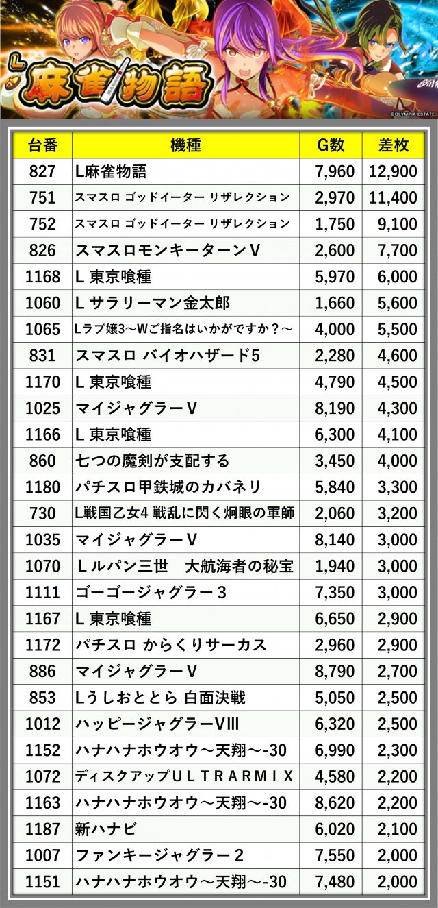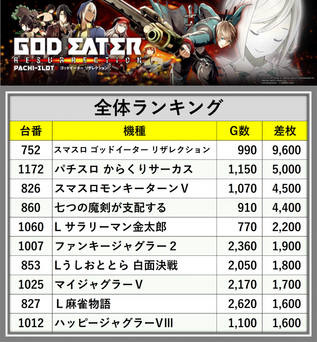 厳選された取材対象機種をはじめ、その他スロット全体から好記録が飛び出した!プレイヤーが楽しんだ1日を下記データにて振り返ってみて欲しい。