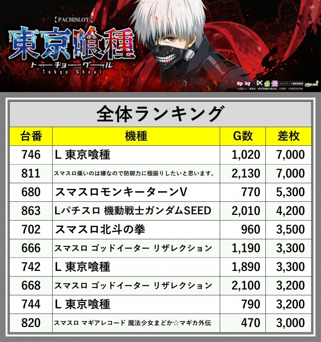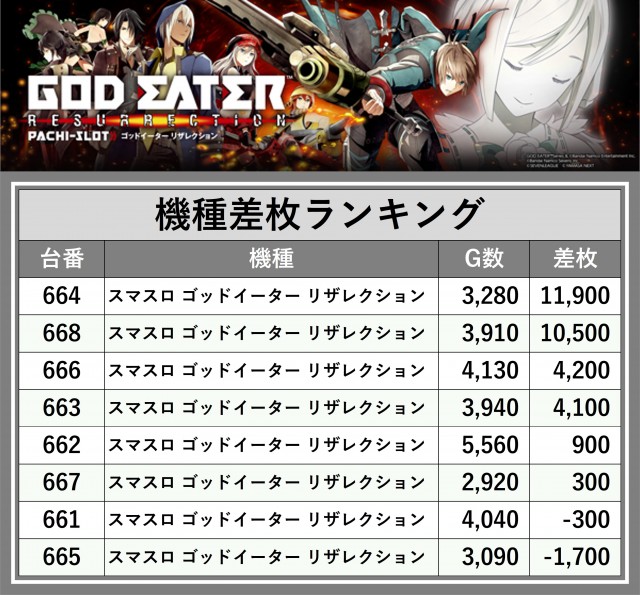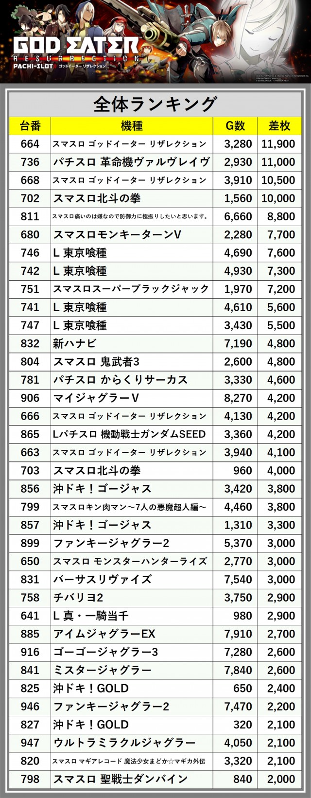 厳選された取材対象機種をはじめ、その他スロット全体から好記録が飛び出した!プレイヤーが楽しんだ1日を下記データにて振り返ってみて欲しい。