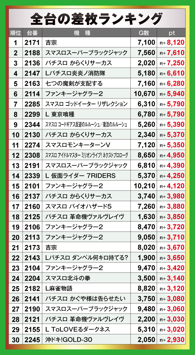また、その他の機種では『パチスロ からくりサーカス』で+7,000pt超、『Lパチスロ炎炎ノ消防隊』で+6,000pt超など、PICK UP機種以外もしっかりとその実力を発揮。店内のありとあらゆるシマにチャンスが潜んでいたのは間違いないだろう。
