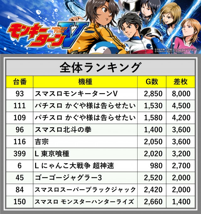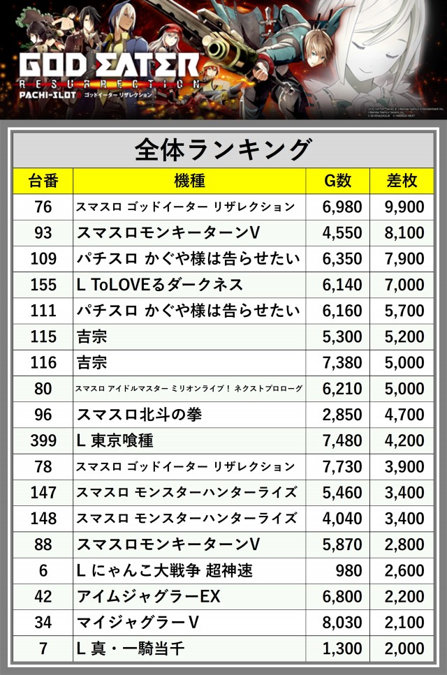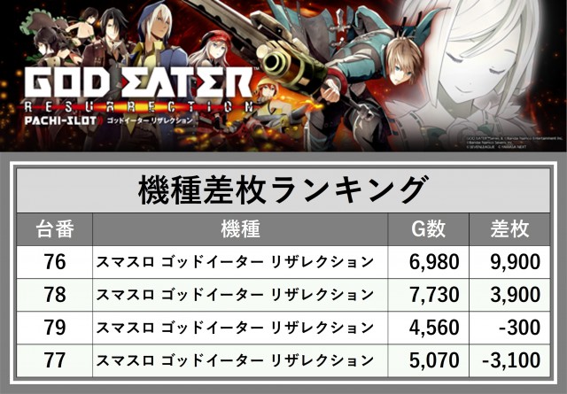 厳選された取材対象機種をはじめ、その他スロット全体から好記録が飛び出した!プレイヤーが楽しんだ1日を下記データにて振り返ってみて欲しい。