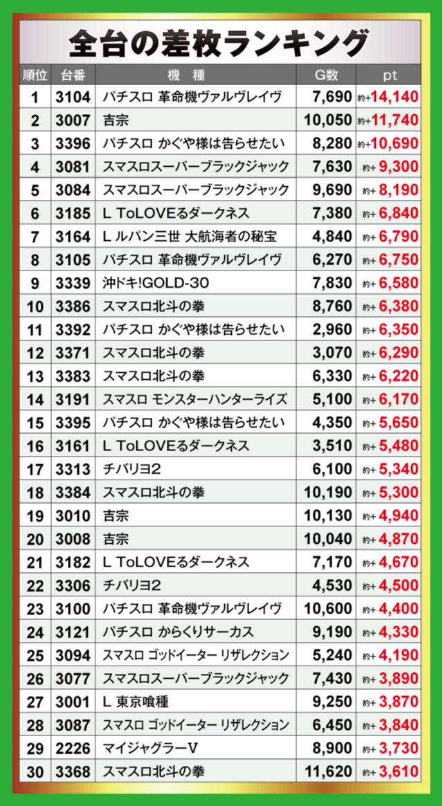また、その他の機種では『L ToLOVEるダークネス』や『Lルパン三世 大航海者の秘宝』など、人気のスマスロを中心に+6,000pt超が大量発生!! 店内のありとあらゆるシマにチャンスが潜んでいたのは間違いないだろう。
