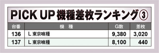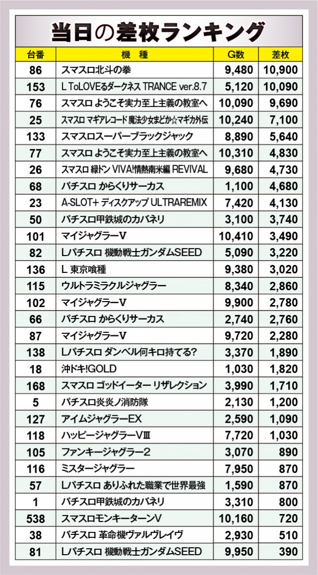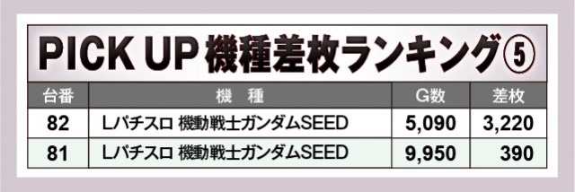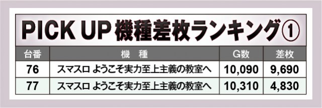優秀機種として名を連ねた5機種は、いずれも大きな活気に包まれていたのが鮮烈であるばかり。その中で『スマスロ ようこそ実力至上主義の教室へ』にて9,000枚OVERが飛び出し、さらには全台万回転OVERかつプラスで終えるという大きなインパクトを残した。『L 東京喰種』『Lパチスロ 機動戦士ガンダムSEED』も全台プラス差枚を達成しており、優秀機種のポテンシャルの高さは計り知れない。