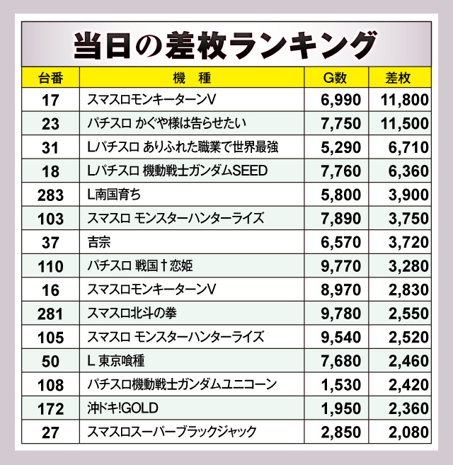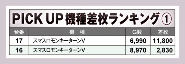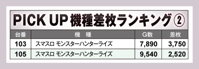 続いては、当日店内を大いに盛り上げた2機種をチェック。2機種どちらからも良台が出現していたが、とくに「スマスロ モンスターハンターライズ」は、ピックアップ2台どちらも差枚+2,000枚オーバーのプラスで終了と上々の結果をマーク! その他の機種も素晴らしく、良台は店内の各所に出現していたぞ!