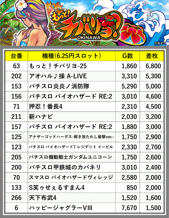 厳選された取材対象機種をはじめ、その他スロット全体から好記録が飛び出した!プレイヤーが楽しんだ1日を下記データにて振り返ってみて欲しい。