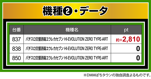 『パチスロ交響詩篇エウレカセブン HI-EVOLUTION ZERO TYPE-ART』では、837番台が約+2,810pt。