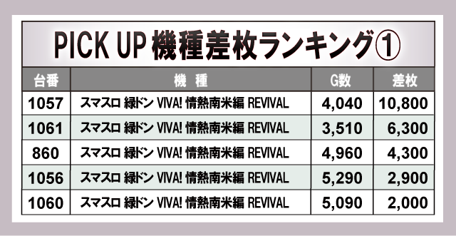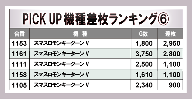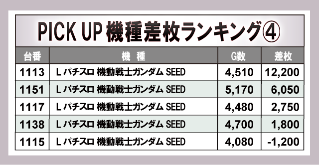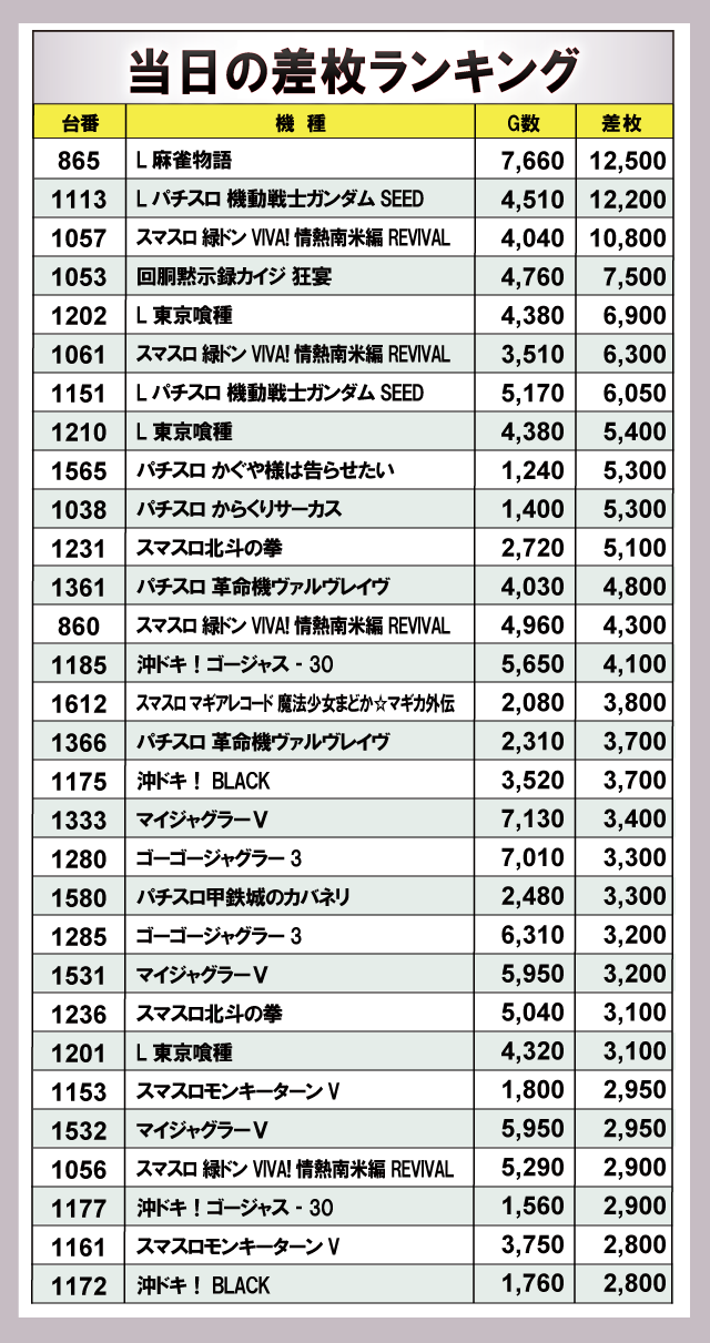 今回の差枚数でトップを飾ったのが『L麻雀物語』で+12,500枚を獲得!次点で『Lパチスロ 機動戦士ガンダムSEED』から+12,200枚、『スマスロ 緑ドン VIVA!情熱南米編 REVIVAL』から+10,800枚と追随し、万枚OVERが3台発生という大きな熱量が確認できた。新台から人気機種まで熱気が放たれており、打ちごたえのある環境が整っていたようだ!