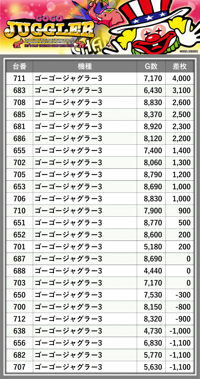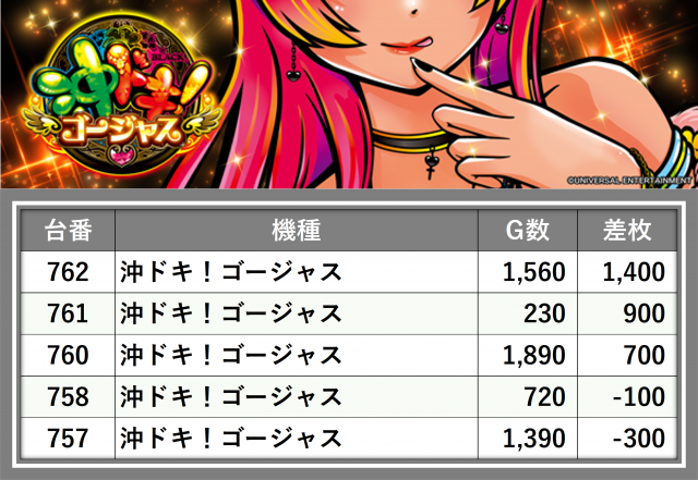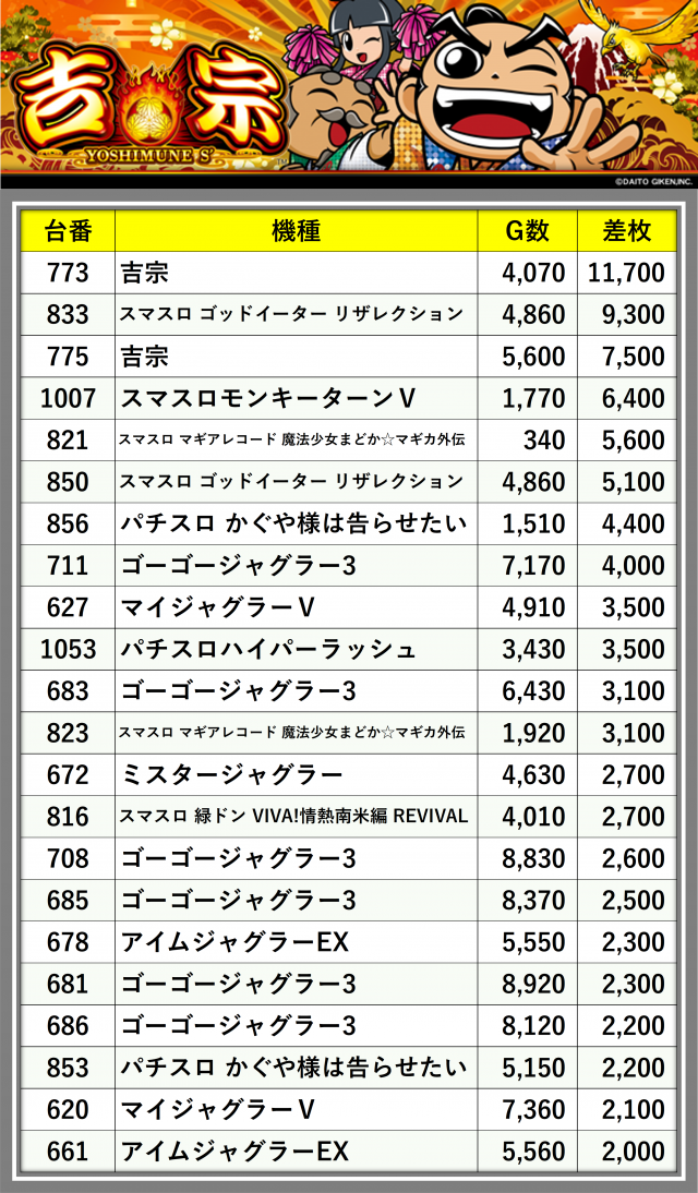 厳選された取材対象機種をはじめ、その他スロット全体から好記録が飛び出した!プレイヤーが楽しんだ1日を下記データにて振り返ってみて欲しい。