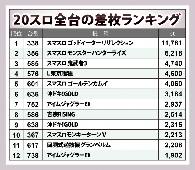 続いて、『スマスロ モンスターハンターライズ』に+6,200枚超、『スマスロ 鬼武者3』に+4,700枚超、『L 東京喰種』に+4,600枚超、『スマスロ ゴールデンカムイ』に+4,100枚弱と、数々のスマスロがポテンシャルを活かしていた。