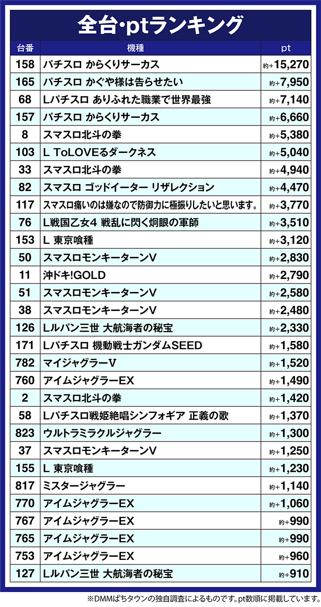 「パチスロ かぐや様は告らせたい」の165番台と「Lパチスロ ありふれた職業で世界最強」の68番台も約+7,100ptオーバー。