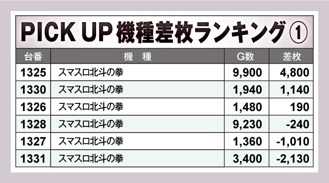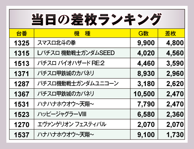 まずは当日の差枚ランキングを紹介していこう。10台のうち9台が差枚+2,000枚オーバーで、それらのなかでもっとも優秀だった台は、1325番台の「スマスロ北斗の拳」で、差枚は+4,800枚と素晴らしい結果をマーク! その他ランクイン機種を見渡すと、「ハナハナホウオウ~天翔~」などの人気機種をはじめ、「Lパチスロ 機動戦士ガンダムSEED」など最新機種も複数台がランクイン。チャンスは店内のアチコチに隠されていた可能性が高そうだ!