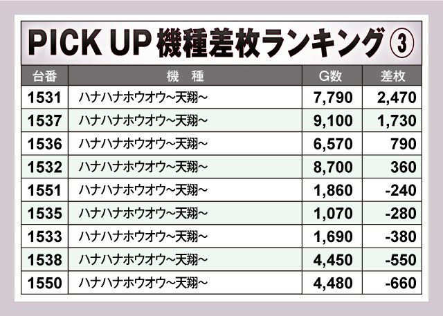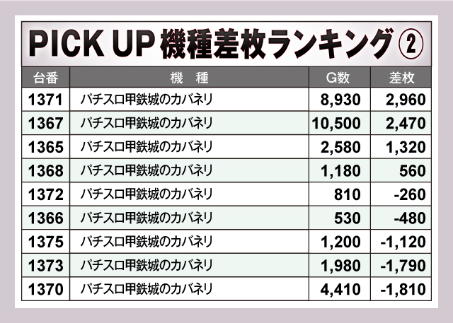 続いては、当日とくに店内を盛り上げた3機種を紹介。3機種とも良台が出現していたが、とくに根強い人気を集める「パチスロ甲鉄城のカバネリ」は、ピックアップ9台のうち4台がプラス差枚で終了しており、そのうち3台が差枚+1,000枚オーバーと圧倒的な数値をマーク! その他多くの機種からも良台を複数確認することができた!