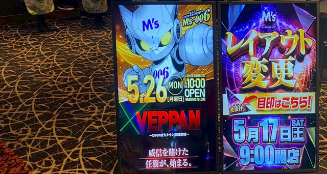 DMMぱちタウン取材班〝別班〟が威信を賭けて執り行う「VEPPAN」が、5月16日に「SLOT BAR M’s」にて実施された。取材当日は朝イチから70人のファンたちが集まり大盛況! 取材時の店内はあらゆるところが活気に溢れ返っていた。果たしてどれほどの盛り上がりを見せていたのか、ここからはスロット全231台の詳細とともに、当日の店内の盛り上がりをチェックしていこう!