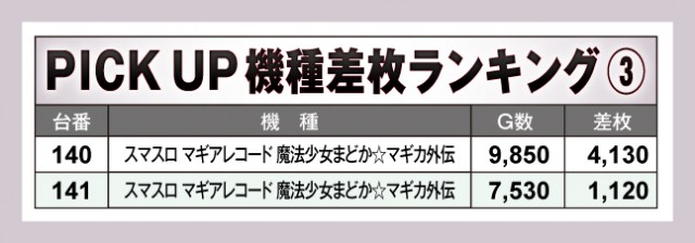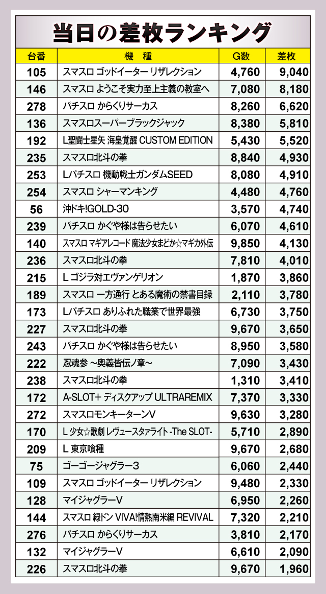 まずは差枚ランキングのチェックから。30台のうち29台が差枚+2,000枚オーバーで、+3,000枚オーバーは21台出現。それらのなかでもっとも優秀だったのは、105番台の「スマスロ ゴッドイーター リザレクション」で、差枚は+9,040枚を獲得! その他ランクイン機種をチェックしてみると、「スマスロ北斗の拳」など人気スマスロ機種をはじめ、「スマスロ ようこそ実力至上主義の教室へ」「スマスロ マギアレコード 魔法少女まどか☆マギカ外伝」などの新機種やジャグラーシリーズまで幅広い機種がランクイン! 訪れたファンたちが存分に楽しめる環境が整っていたようだ!