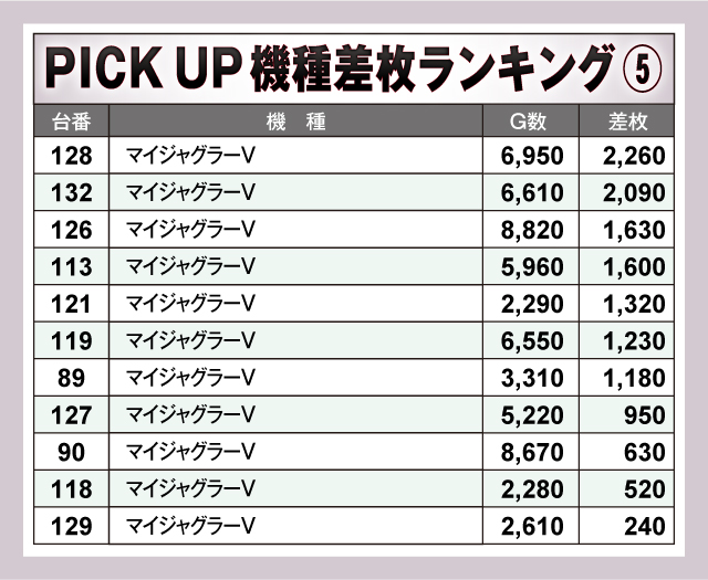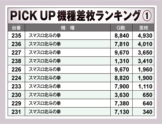 続いては、当日とくに盛り上がっていた5機種を紹介。5機種どれもが好成績をマークしており、ピックアップ台すべてがトータルプラス終了と圧巻! とくに「スマスロ北斗の拳」は、ピックアップ10台のうち7台が+1,000枚以上のプラスで終了しており、その他4機種にも良台が多数確認することができた。これらの機種たちの盛り上がりを見れば、当日どれだけ賑わっていたのかが分かってもらえるハズだ!
