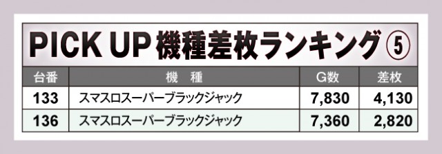 続いては、当日店内を大いに盛り上げた5機種をチェック。5機種とも好記録が出現していたが、とくに「スマスロ北斗の拳」は、ピックアップ11台のうち7台が差枚+1,000枚超えと上々の結果をマーク! その他の機種も素晴らしく、店内は大いに盛り上がっていたぞ!
