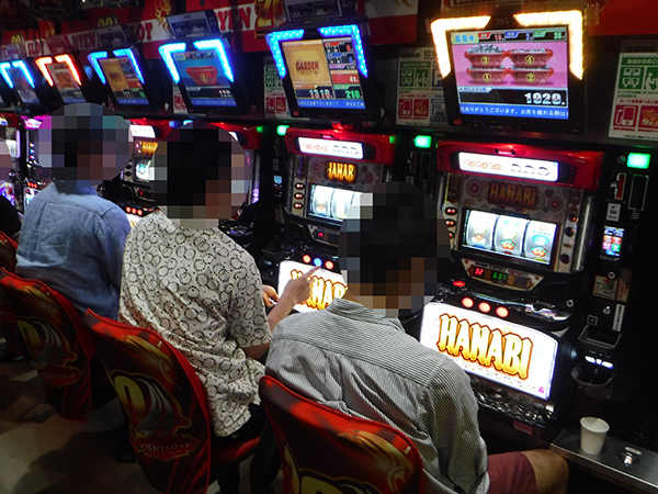 14時過ぎに1000円/47枚パチスロを見てみると、定番機種を筆頭に大盛況。SLOT魔法少女まどか☆マギカシリーズやバジリスクシリーズ、押忍!番長シリーズでは、機種の性能を引き出したプレイヤーを数多く確認しており、シマ全体が活気に満ちあふれていた。