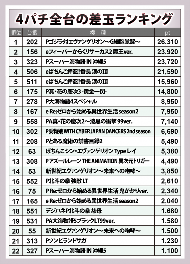 パチスロが対象となる当タイトルだが、4パチも出玉データを入手したため、こちらもお知らせしたい。