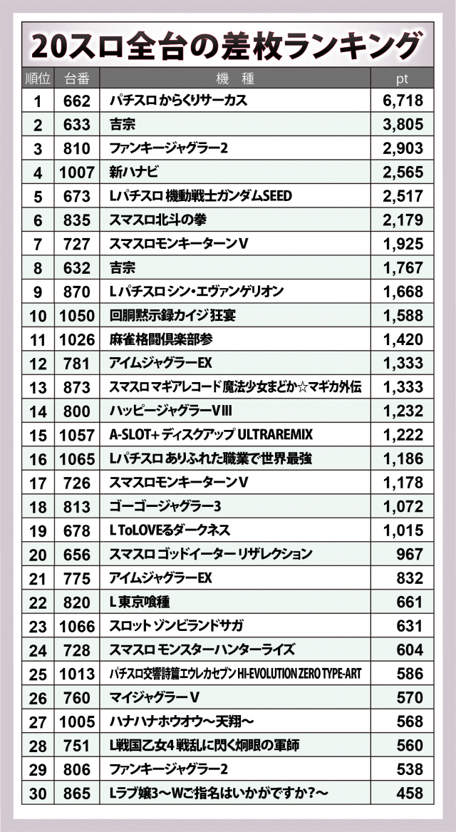 下で記す3機種を除くと、『ファンキージャグラー2』『Lパチスロ 機動戦士ガンダムSEED』『スマスロ北斗の拳』と、新旧取り合わせたラインナップが好出玉をマーク。