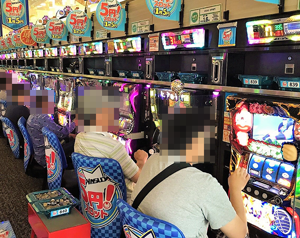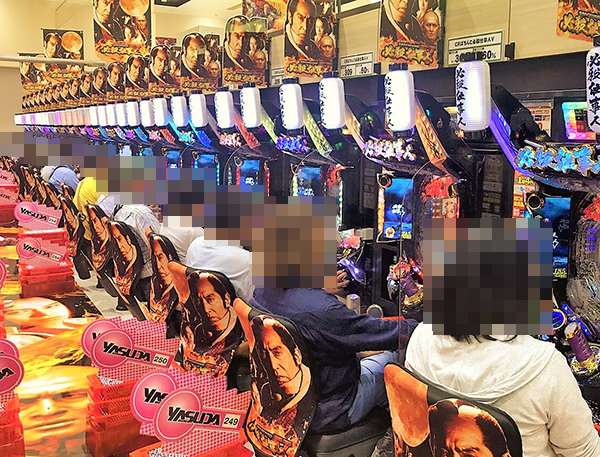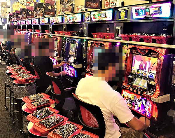15時頃の20円パチスロにおいて、もっとも目立っていたのが「バジリスク~甲賀忍法帖~絆」。うらやましさを覚えるほどの華やかな光景が広がっており、プレイヤーたちは有意義な時間を過ごせているように思えた。