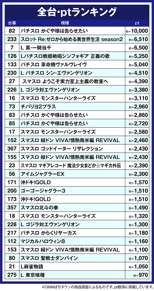 「L パチスロ シン・エヴァンゲリオン」の230番台や「 スマスロ ようこそ実力至上主義の教室へ」の27番台も約+4,300ptを上回った。