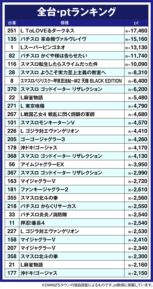 「Lスーパービンゴネオ」の1番台や「パチスロ かぐや様は告らせたい」の82番台、「スマスロ転生したらスライムだった件」の116番台も約+10,000ptを上回った。