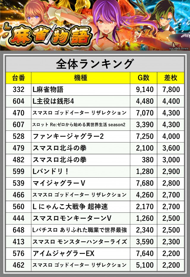 厳選された取材対象機種をはじめ、その他スロット全体から好記録が飛び出した!プレイヤーが楽しんだ1日を下記データにて振り返ってみて欲しい。