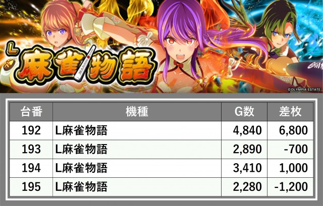 厳選された取材対象機種をはじめ、その他スロット全体から好記録が飛び出した!プレイヤーが楽しんだ1日を下記データにて振り返ってみて欲しい。