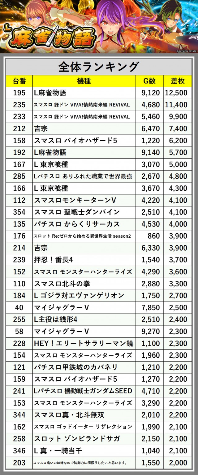 ※差枚数順に掲載しています