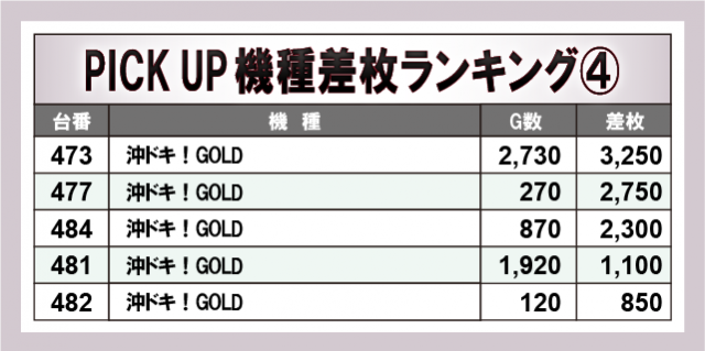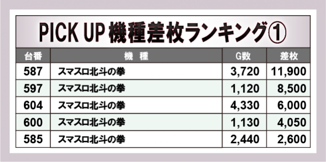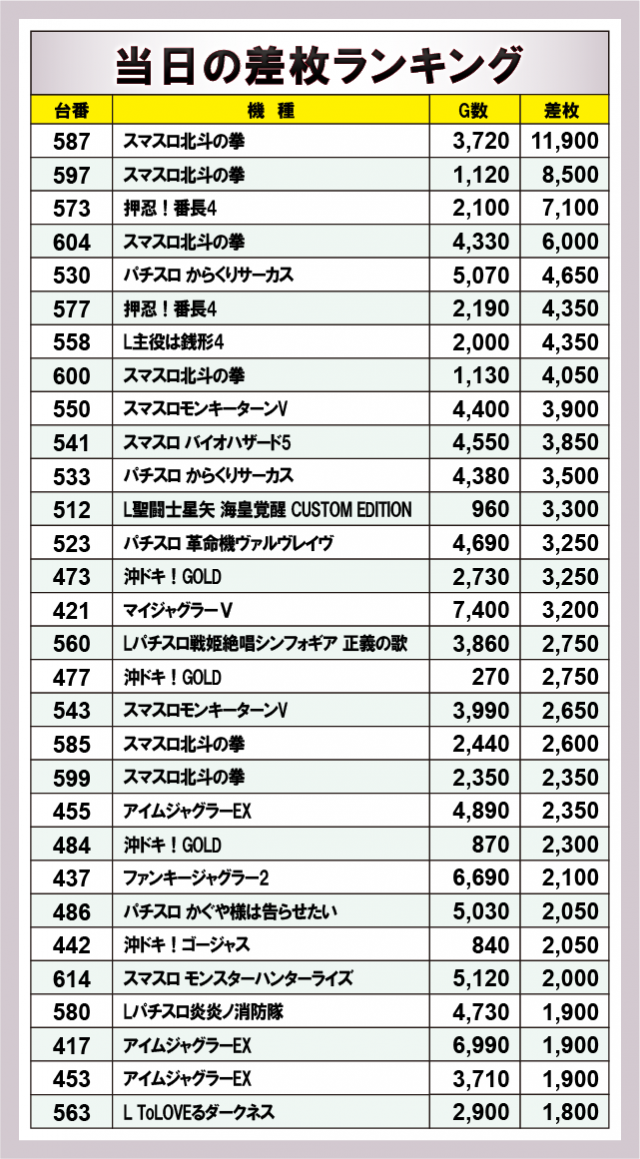 まずは優秀台30台のチェックから。この日のトップを飾ったのは587番台の『スマスロ北斗の拳』で、差枚は+11,900枚と素晴らしい記録をマーク! その他、人気のスマスロ機を筆頭にメダル機も多数ランクインしており、『沖ドキ!GOLD』や『ジャグラー』シリーズなど、店内のあらゆる機種にチャンスがあったようだ!