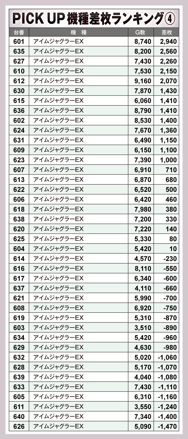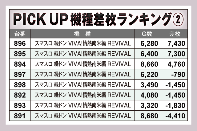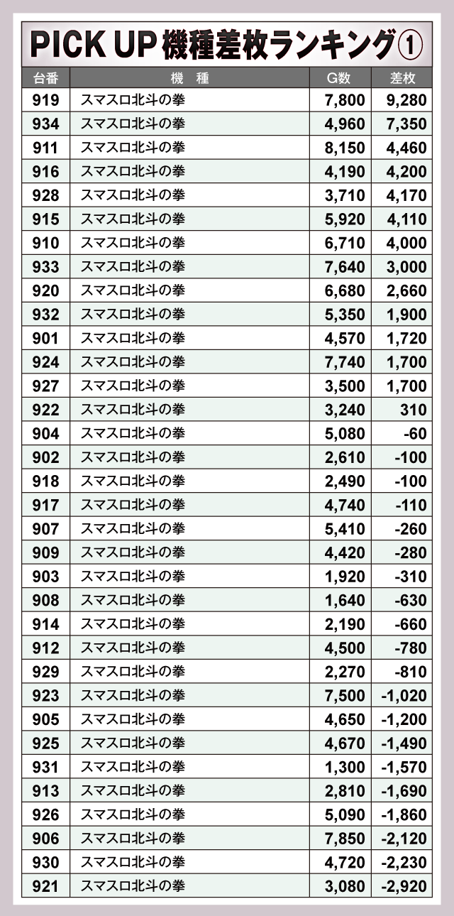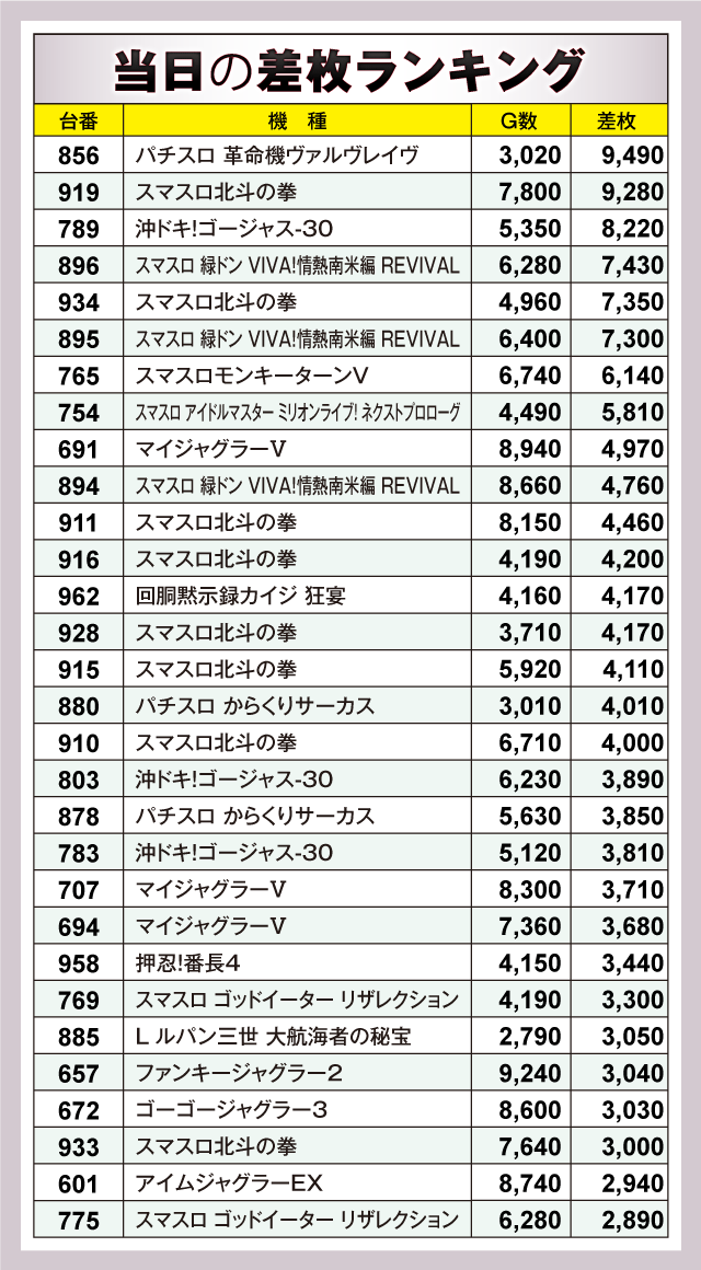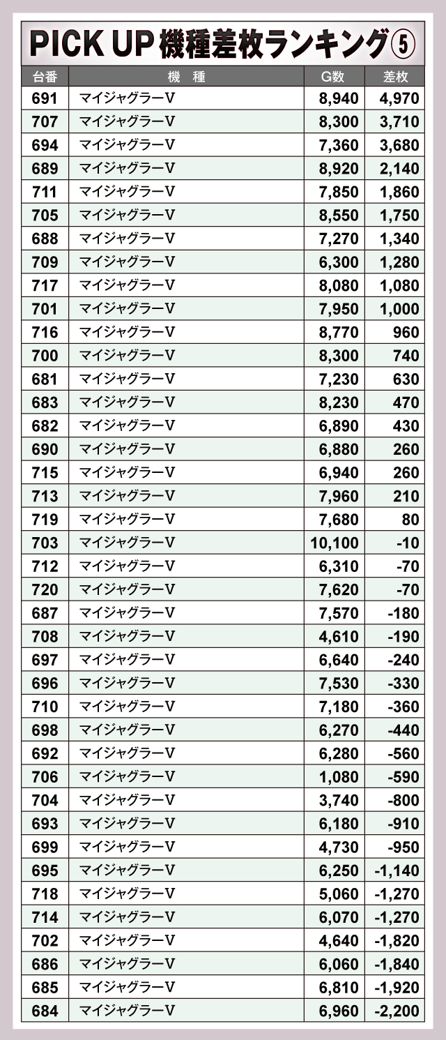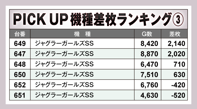 続いてPICK UP機種の状況をチェックしていこう。『スマスロ北斗の拳』はランキング上位台以外にも+4,000枚超が4台、『スマスロ 緑ドン VIVA!情熱南米編 REVIVAL』からは+7,000枚超が2台も発生。さらに、3つのジャグラーシリーズは、約半数の台がプラス差枚となる結果を残しファンを喜ばせていた。