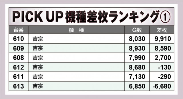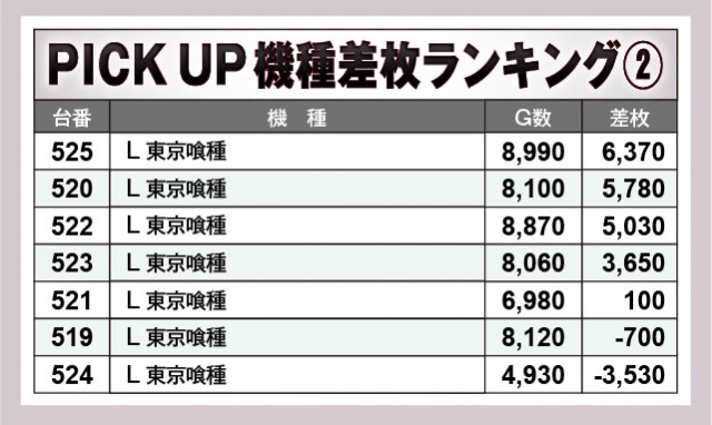 前述したように『吉宗』にて8~9,000枚OVERと大きな熱気が放たれ、さらに『L 東京喰種』も5~6,000枚OVERと、優秀機種が盛り上がりをリード。両機種とも半数以上でプラス差枚数を達成しており、それは大量設置された『アイムジャグラーEX』も同様だ。回転数と差枚数が比例した展開が顕著であり、いずれも好感触を得られる絶好のエリアだったのは間違いない。